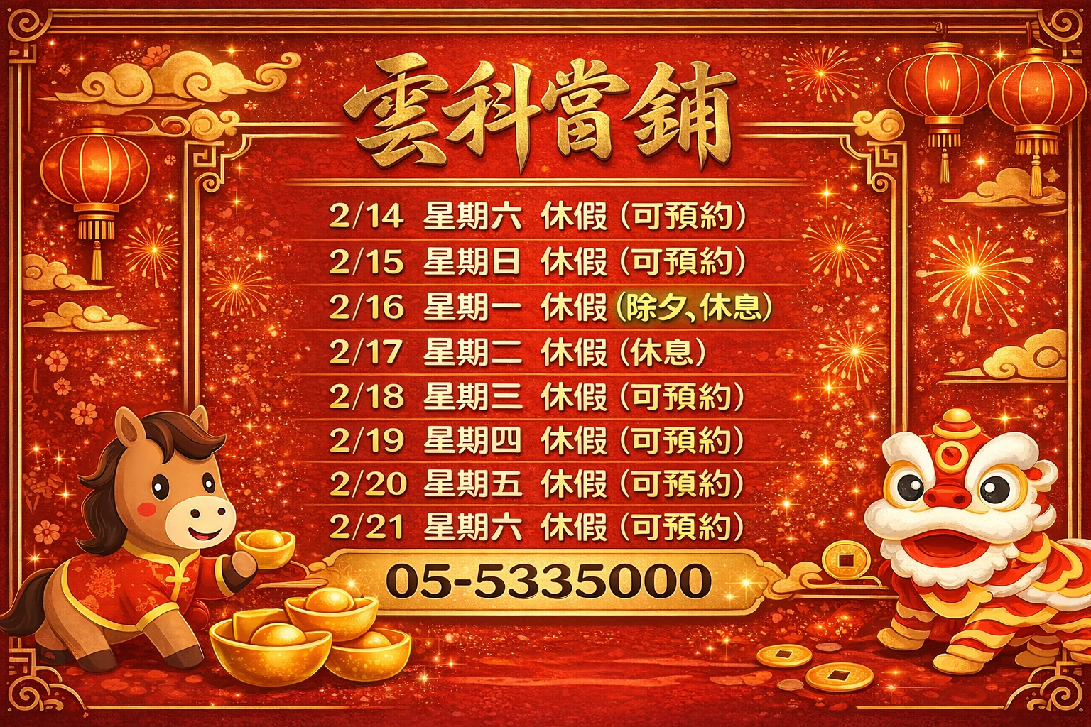 農曆春節期間,雲科當舖 配合年節進行休假安排。